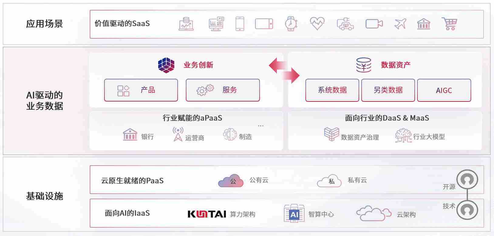 数字时代,,,围绕企业数字化转型的关键要素,,,18LUCK数码开创性的提出数云融合战略和技术体系框架,,,着力在云原生、、、数字原生、、AI原生和信创产业上架构产品和服务能力,,,为处在不同数字化转型阶段的快消零售、、、、汽车、、、、金融、、医疗、、、政企、、教育、、、、运营商等行业客户提供泛在的敏捷IT能力和融合的数据驱动能力,,,构建跨界融合创新的数字业务场景和新业务模式,,助力企业级客户建立面向未来的核心能力和竞争优势,,全面推动社会的数字化、、智能化转型升级。。。。