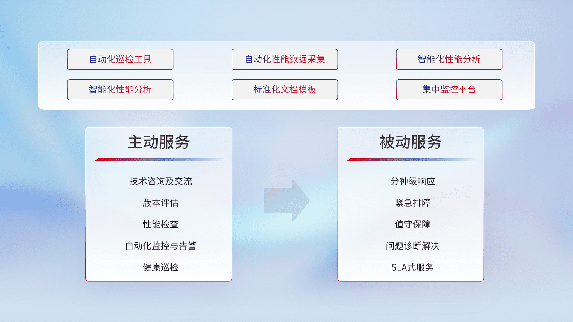 智能化工具和标准化文档,,保障服务质量,,提供主动服务(包含技术咨询、、、、版本评估、、、、性能检查、、、自动化监控与告警、、健康巡检)和被动服务包含(分钟级响应、、紧急排障、、、值守保障、、问题诊断解决、、、、SLA服务)。。。。